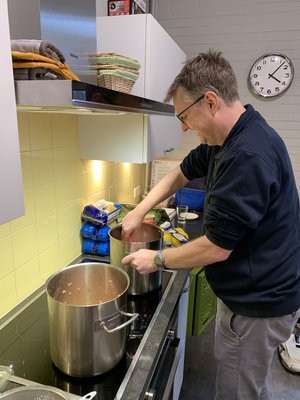 De laatste restjes uit de pannen gingen in de vertrouwde plastic doosjes en in bewaard in de vriezer. De rest van de soep werd op de middag van de dag erop genuttigd. Alle pannen waren dus ook nu weer schoon op. Een groot applaus viel onze chefs ten deel.